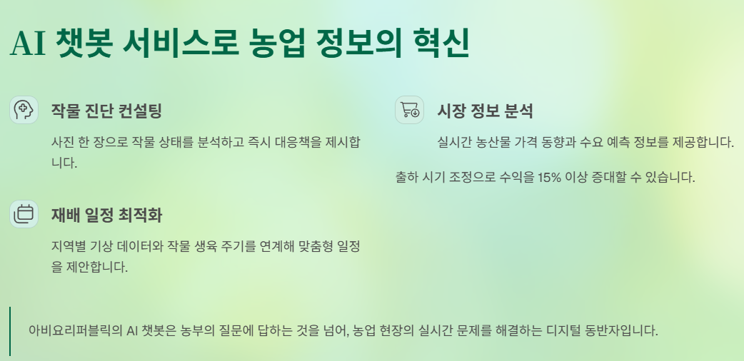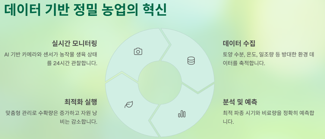 - 토양 조건: 토양 수분 함량, pH, 영양분 함량 (질소, 인, 칼륨 등), 토양 온도 (토양 센서).